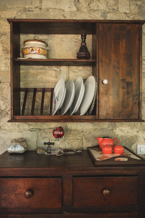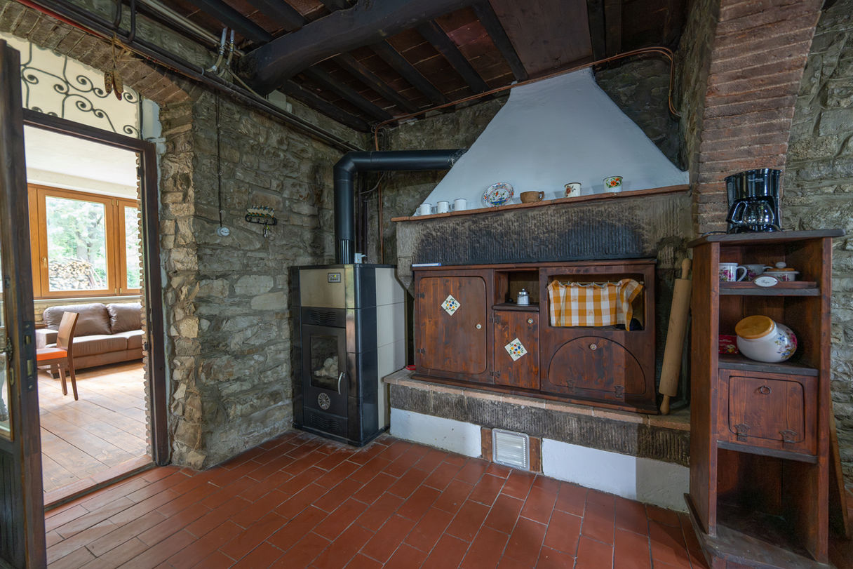 traditionelle, toskanische voll ausgestattete Küche mit Gasherd, Backofen, Toaster, Kaffeemaschine, Wasserkocher, Kühl- und Gefrierschrank, Esstisch und Holzofen.