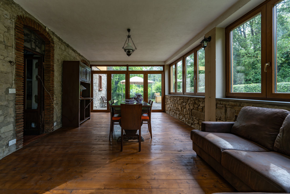 großzügiger Wintergarten mit Esstisch, Couch und kleiner Bibliothek (Bücher in deutsch und italienischer Sprache)