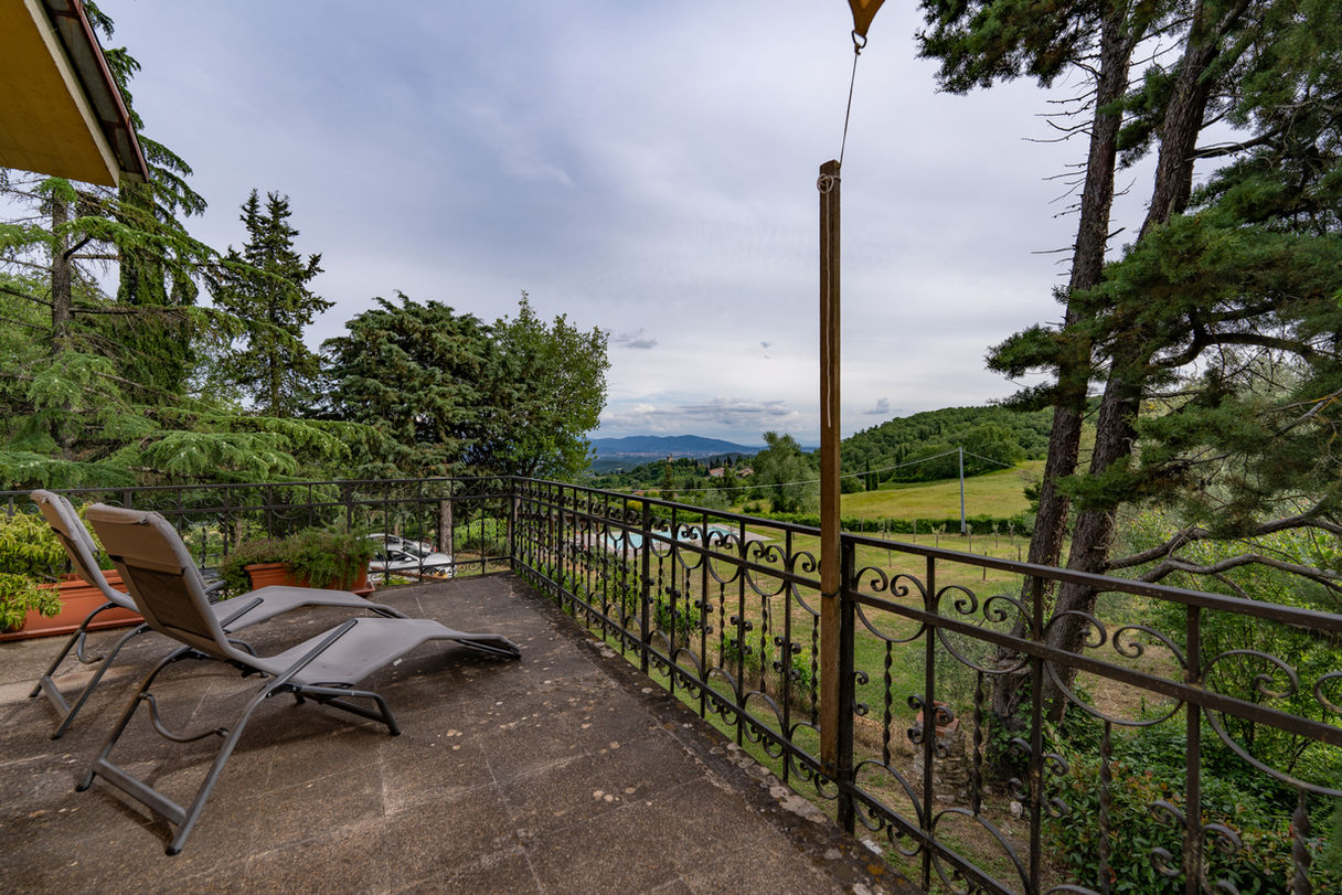 Das Anwesen liegt auf einem Hügel in absoluter Alleinlage und bietet einen atemberaubenden Blick auf die Stadt Arezzo und die typische toskanische Landschaft. Umgeben von Olivenhainen und Obstbäumen, verfügt das Grundstück über einen großzügigen Salzwasserpool, der zur Entspannung einlädt. Das Gelände ist eingezäunt und mit einem elektrischen Tor gesichert, wodurch Ruhe und Privatsphäre garantiert sind.